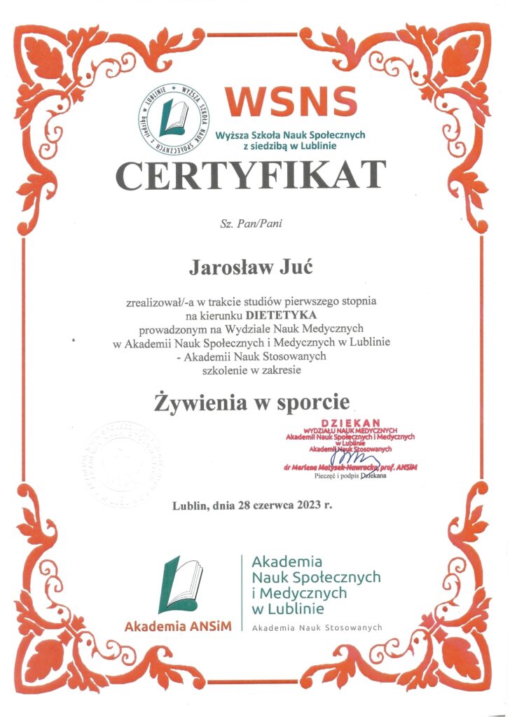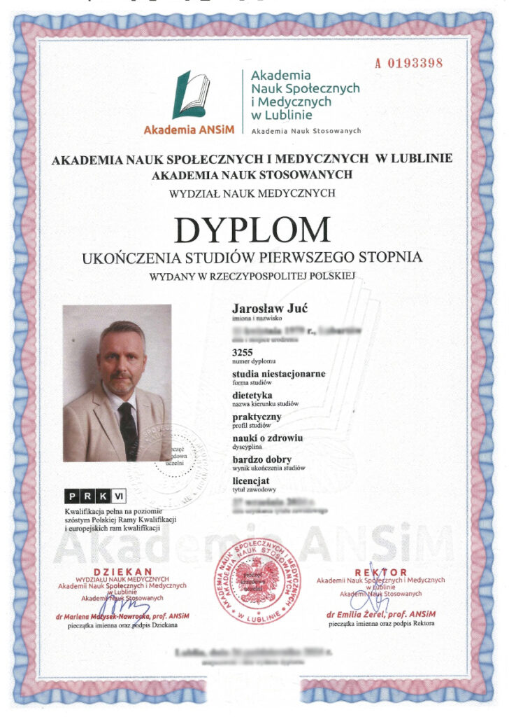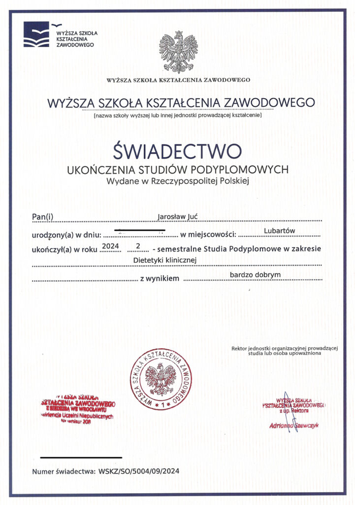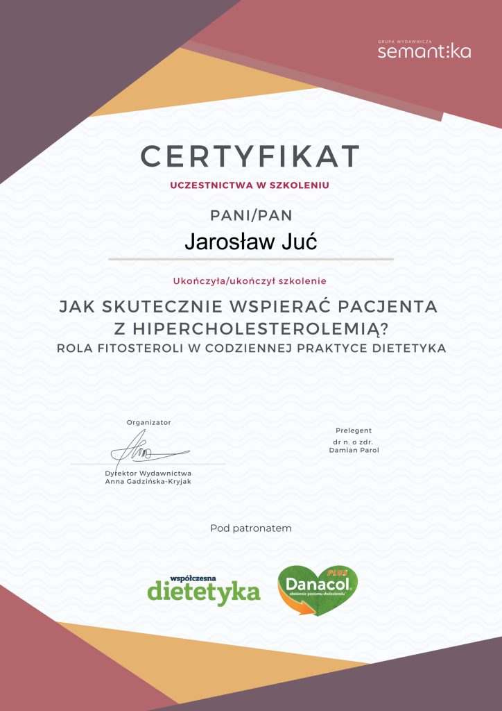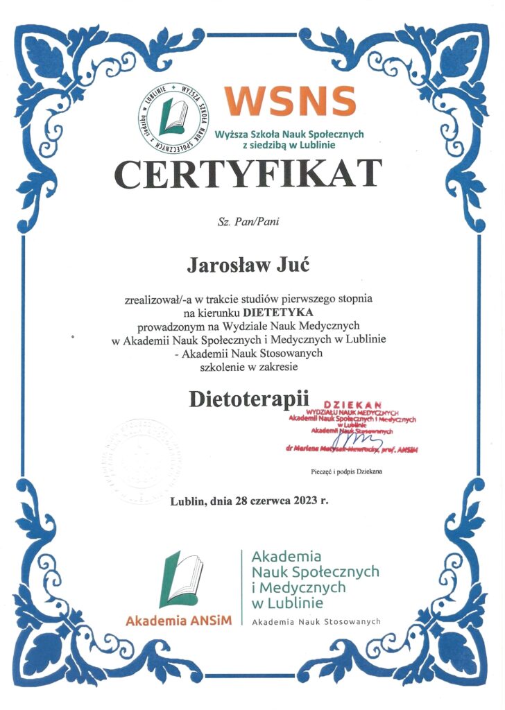 Poza ukończonymi studiami na wydziale nauk medycznych, stale poszerzam swoją wiedzę. Analizuję artykuły naukowe, przeglądam najnowsze badania dotyczące nie tylko ciała i umysłu człowieka, ale również wszystkiego co związane jest z pożywieniem. Prenumeruję i czytam prasę branżową poddając treść artykułów własnym przemyśleniom. Szkolę się u najlepszych dietetyków w kraju oraz korzystam z konferencji naukowych. Certyfikaty i dyplomy, które przedstawiam oddają czas poświęcony na dodatkową wiedzę. Wiele ze szkoleń zakończonych jest egzaminem potwierdzającym nabytą wiedzę i kwalifikacje.
