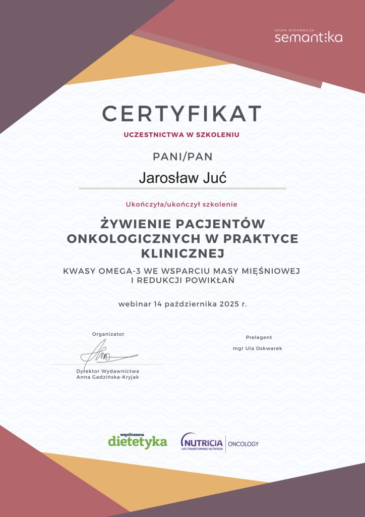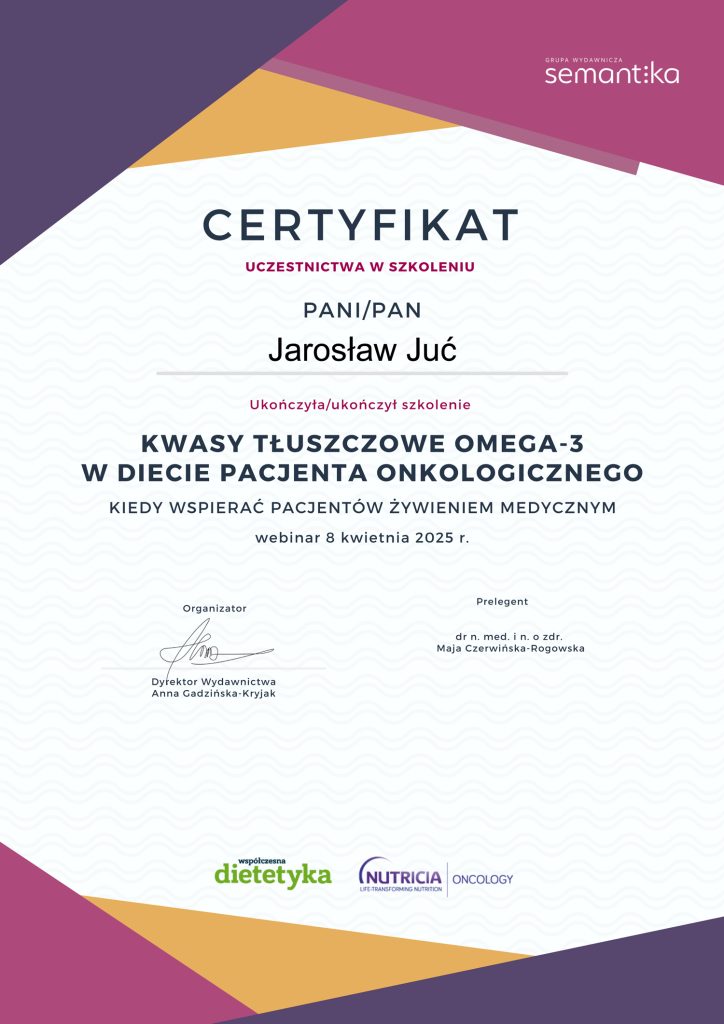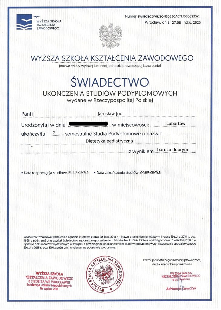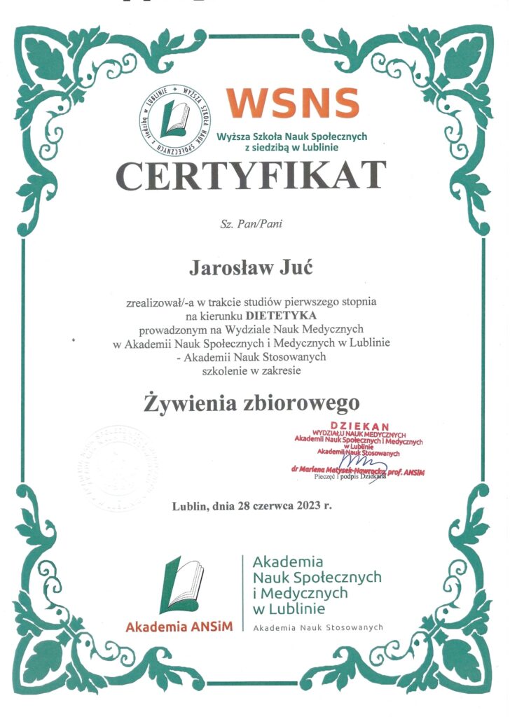 Poza ukończonymi studiami na wydziale nauk medycznych, stale poszerzam swoją wiedzę. Analizuję artykuły naukowe, przeglądam najnowsze badania dotyczące nie tylko ciała i umysłu człowieka, ale również wszystkiego co związane jest z pożywieniem. Prenumeruję i czytam prasę branżową poddając treść artykułów własnym przemyśleniom. Szkolę się u najlepszych dietetyków w kraju oraz korzystam z konferencji naukowych. Certyfikaty i dyplomy, które przedstawiam oddają czas poświęcony na dodatkową wiedzę. Wiele ze szkoleń zakończonych jest egzaminem potwierdzającym nabytą wiedzę i kwalifikacje.