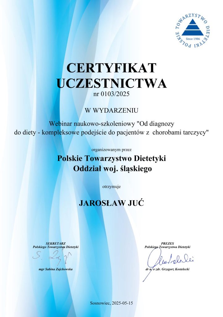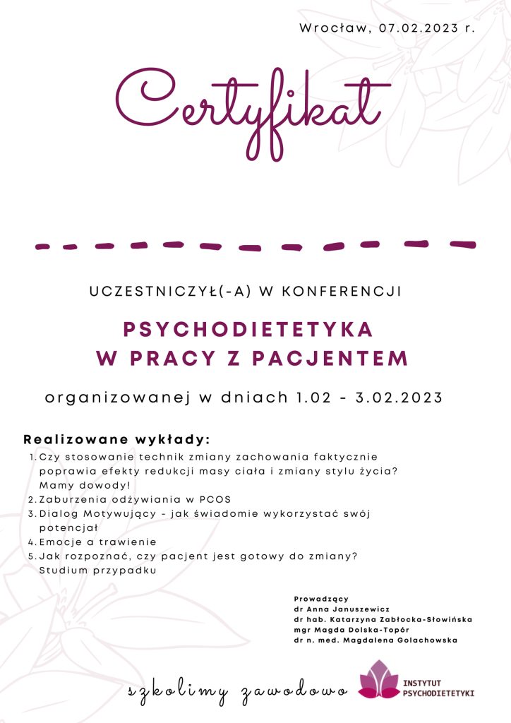 Niezależnie od studiów dietetycznych nieustannie szkole się i poszerzam swoją wiedzę z zakresu dietetyki. Jednym z wyróżnień jest certyfikat Fundacji Insulinooporność, która od wielu lat zajmuje się tematyką insulinooporności, a ich działania obejmują nie tylko pacjentów, ale również dietetyków, lekarzy, fizjoterapeutów, trenerów, czy psychologów.