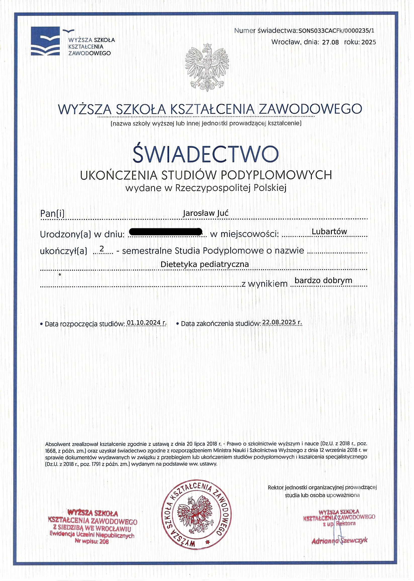 Studia ukończyłem z oceną „bardzo dobry”, uzyskując tytuł zawodowy „Dietetyk”. Tematem pracy dyplomowej była: „Ocena autorskiej mobilnej aplikacji dla cukrzyków na podstawie badań ankietowych”.