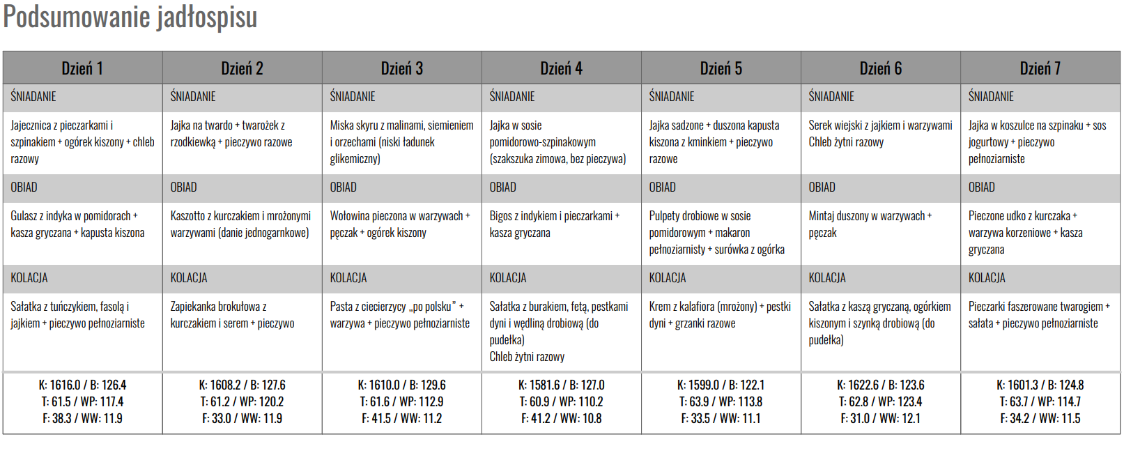 Jadłospis 1600 kcal, 3-posiłkowy (śniadanie, obiad, kolacja), wariant redukcyjny, opracowany z myślą o poprawie sytości, kontroli apetytu oraz „wypłaszczeniu” poposiłkowych wahań glikemii. Model żywienia ma charakter umiarkowanego low carb i jest przeznaczony dla osób z zaburzeniami metabolicznymi, w tym z insulinoopornością, cukrzycą oraz dla osób z cechami zespołu metabolicznego bez formalnego rozpoznania.